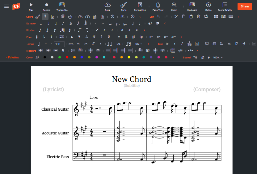 Noteflight has an easy and mostly intuitive user interface that allows a composer to bring in almost any instrument. The patch quality is ok, which is why I use other software to complete my tracks, and there’s a limited set of patches available. In addition, the guitar tab feature could be improved. But overall, it’s completely usable and works well for the ideation phase.