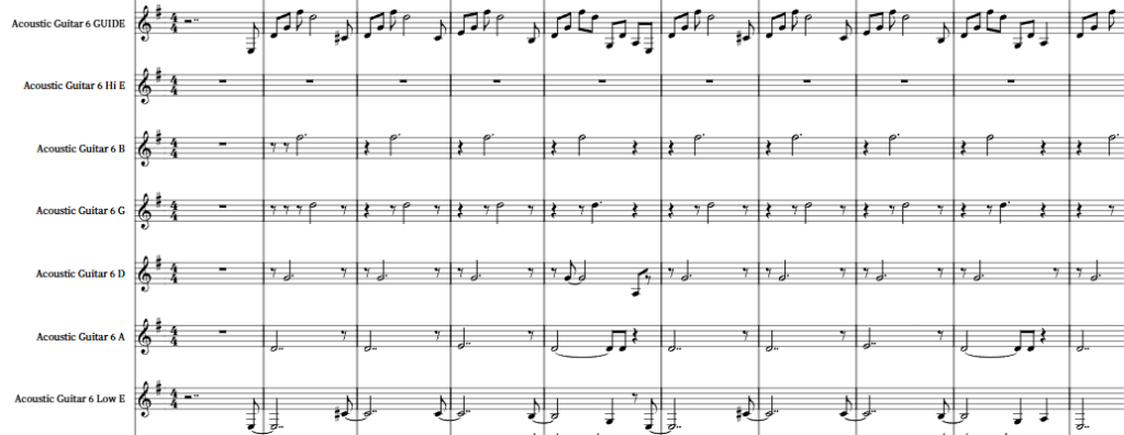 As I’ve mentioned, I’m not the best guitar player. I will definitely record my acoustic guitar chords live, but some of the more complex picking parts I can’t execute for a variety of reasons. I end up mapping them out as tracks and I’ve found an excellent patch within Reason that sounds reasonable enough to accomplish what I need. I’ve seen articles on line where people kind of push back on this due to having to map each string, but that’s exactly what I do. I write a guide track, then I map each string to its own patch, primarily to allow me to ring strings against each other just like an actual guitar would allow. While this does take time in Notion and Noteflight, the result is worth it.